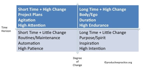 Goals and Projects have shorter time horizons and encounter more change. Qualities like attention, adjustment, completion and acknowledgement would apply.